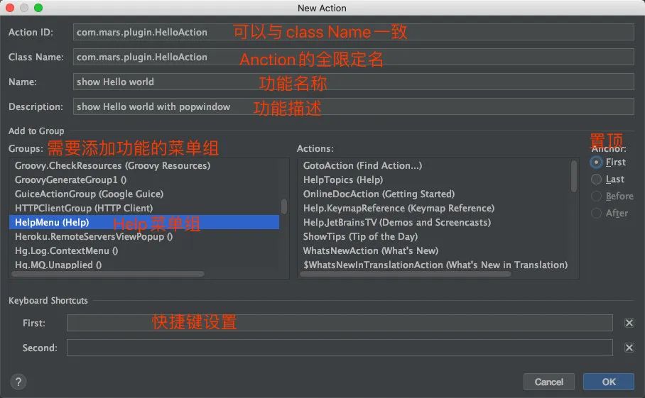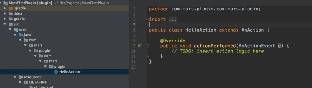 填写好 action 的一些基本设置后点击 ok,idea 就自动把 HelloAction 给实现,并注册到 plugin.xml 文件中。