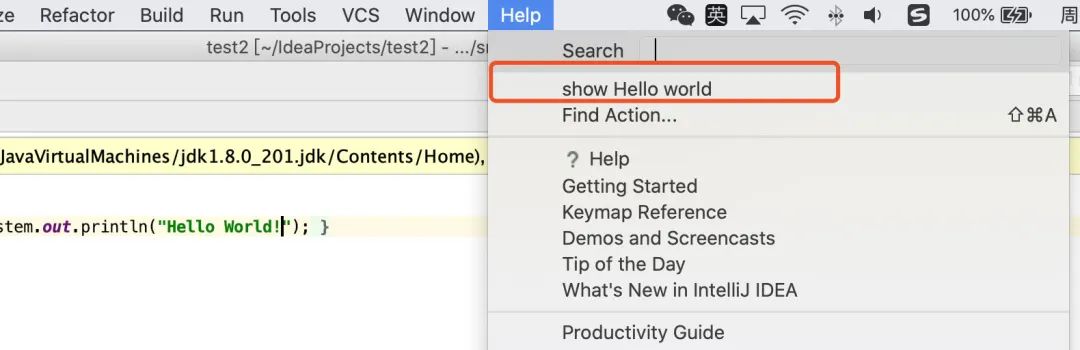 导入项目后,我们点击 help 菜单栏,就可以发现我们定义的 show hello world 就在第一位。