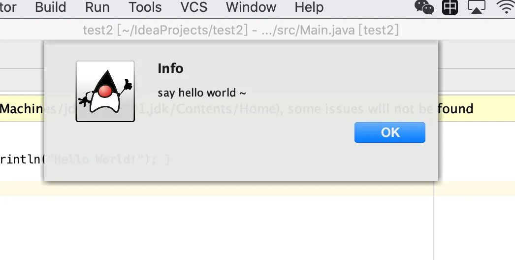 Messages.showMessageDialog(project, "say hello world ~", "Info", Messages.getInformationIcon());