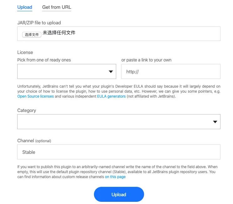 然后上传我们上面生成的 zip 文件,并填写一些信息、比如开源证书和插件分类,然后点击 upload 就等待审核通过吧。