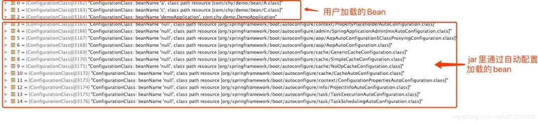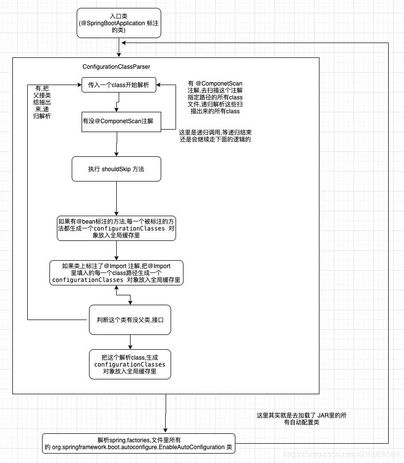 的方法是用来解析配置类的,其实也就是我上图画的那个大框。这个方法首先传入的是一个带有@SpringBootApplication