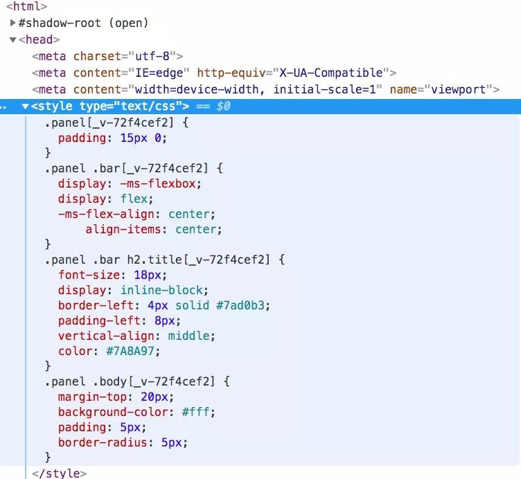 样式文件已经转换好了,但并不会产生任何效果。因为这些样式还没有添加到页面中,这时候就该轮到 style-loader 出场了,它的作用就是把转换后的样式添加到页面中,就像下面这样。