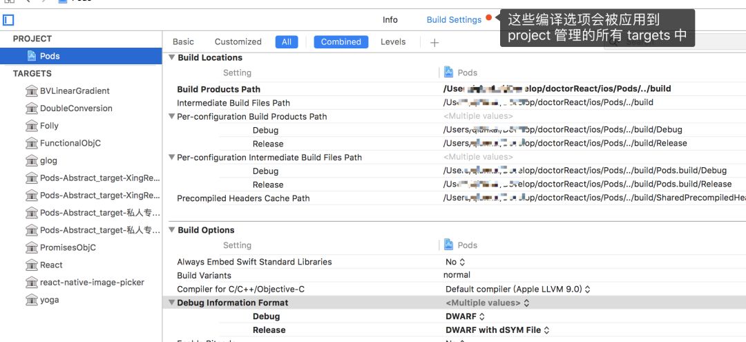 我们也可以对 project 进行配置,包括基本信息和编译选项(Build Settings)等,这些配置会应用到它管理的所有 targets 中,但是如果 target 有自己的配置,则会覆盖 project 中对应的配置。
