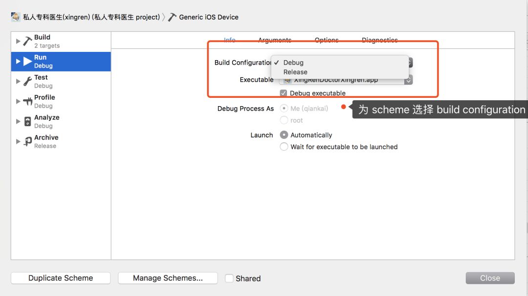 Scheme 中最重要的一个配置是选择 target 的 build configuration,对每一个 project,会有两个默认的 build configuration:debug 和 release。
