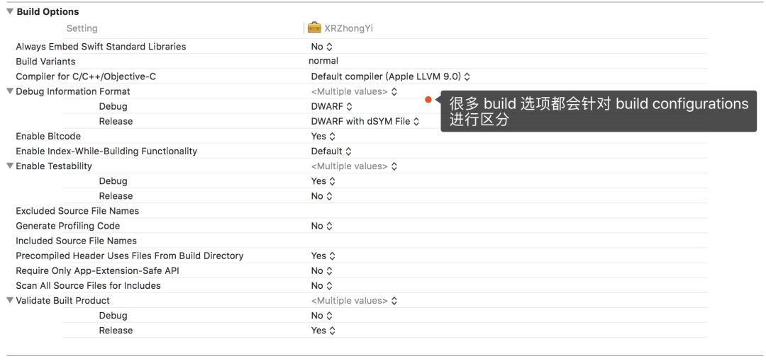 每个 configuration 对应了 build target 时不同的参数集,比如宏,编译器选项,bundle name 等等。我们可以在 target 的配置页中更改这些选择项,也可以自己创建新的 build configuration,比如为 App 创建免费和付费版本的配置。