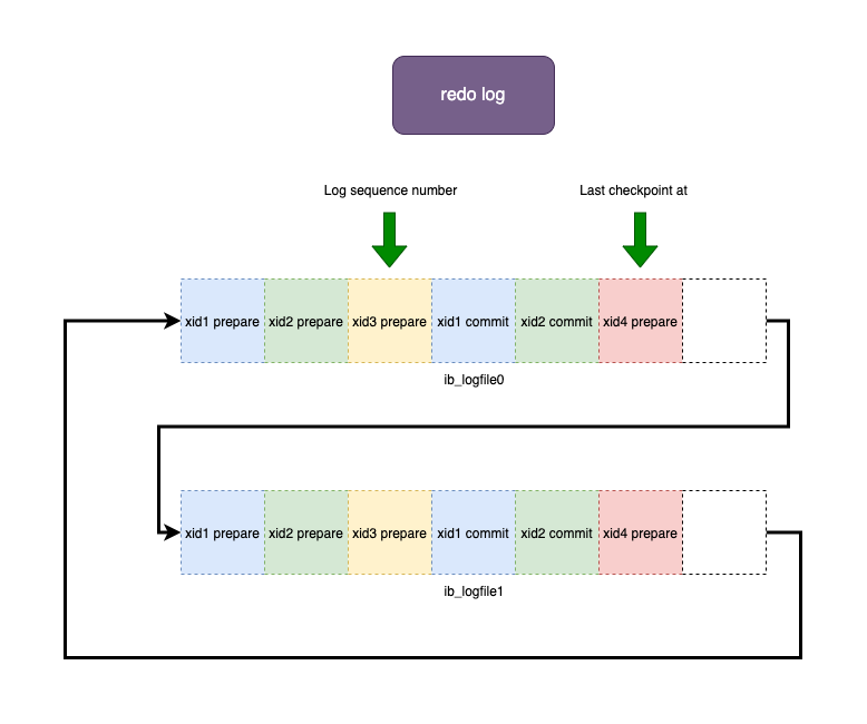 大小是固定的,所以总有写满的时候。那写满了怎么办,总不能直接把数据丢了吧。所有就有了这个类似于环的结构。日志一直写,当写完 ib_logfile1