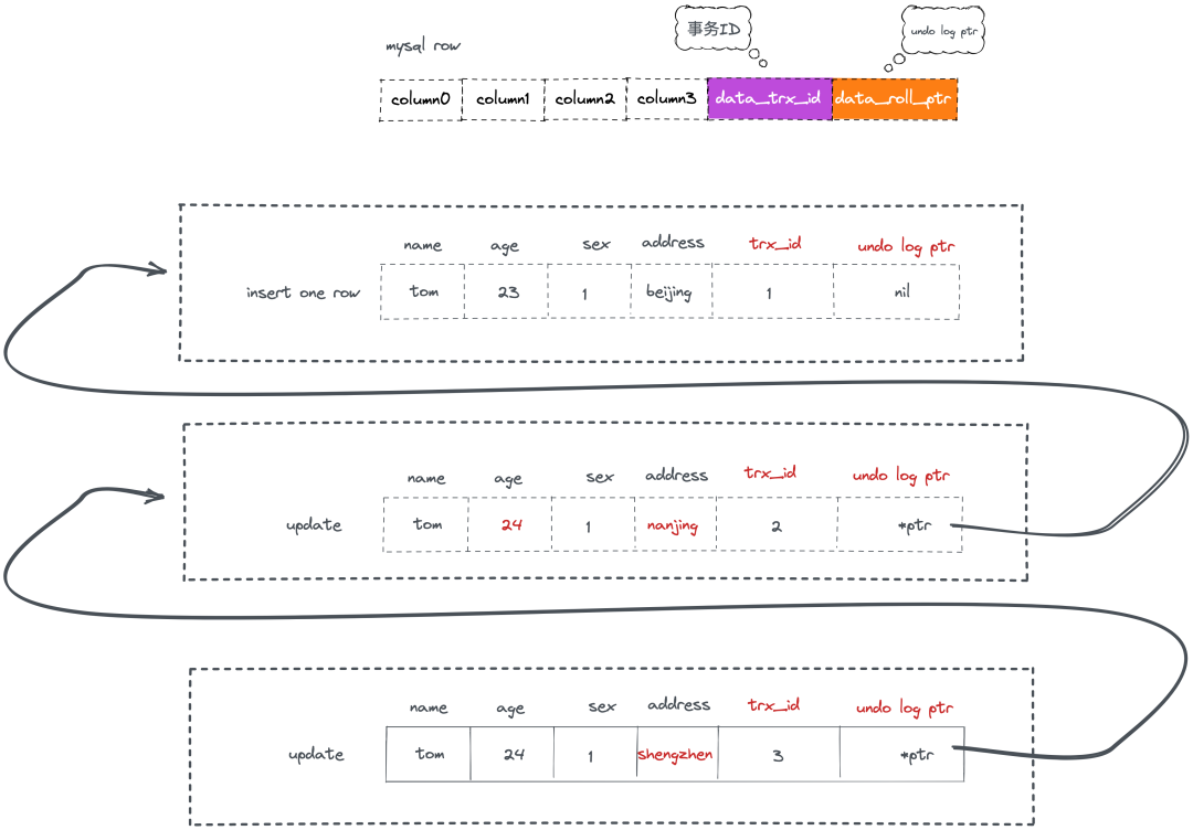 trx_id。事务ID roll ptr。指向上一个数据版本的指针,用于回退版本