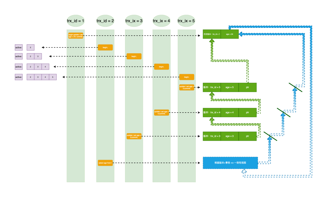 找到 age = 3 版本的 trx_id = 3。判断 >= 当前事务的高水位,不可见。继续根据 ptr 找 age = 4 的版本。 找到 age = 4 版本的 trx_id = 4。判断 >= 当前事务的高水位,不可见。继续根据 ptr 找 age = 5 的版本。 找到 age = 5 版本的 trx_id = 5。判断 >= 当前事务的高水位,不可见。继续根据 ptr 找 age = 24 的版本。 找到 age = 24 版本的 trx_id = 1。判断 < 当前事务的低水位,可见。