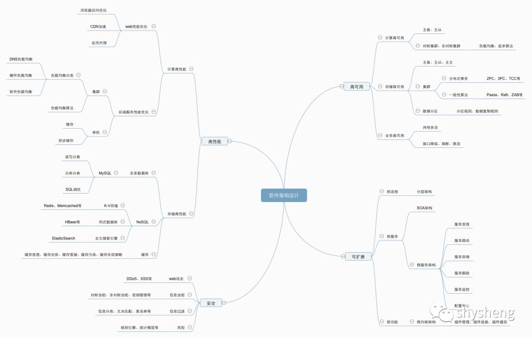 所以架构设计主要也就是围绕这几个方面展开。但由于本人目前对架构认识有限,所以这里并不打算针对每一点具体展开,就简单画个脑图吧,算是指导自己在架构进阶路之路上的一份学习指南。