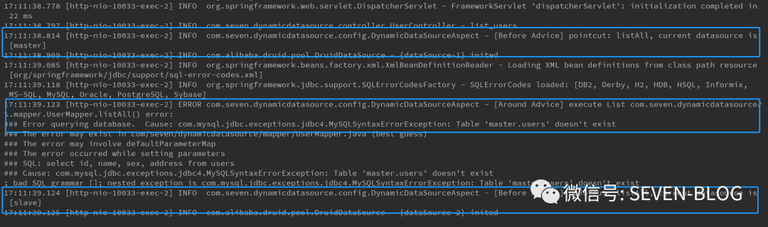请求日志见下图:首先使用 master 查询,出现异常,自动切换到 slave 查询