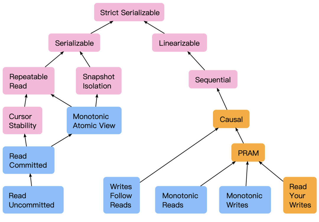 上图摘自 https://jepsen.io/consistency,这是一个对一致性比较好的分类和总结。