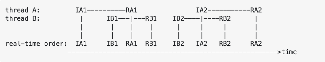其中,I 代表 invocation,R 代表 response,A、B 代表不同的线程,1、2 代表不同的对象。