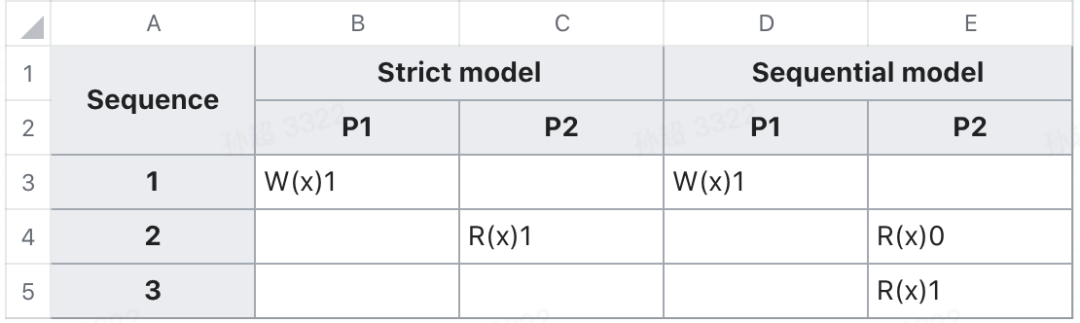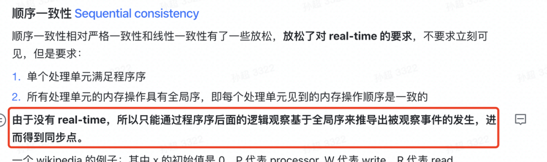 顺序一致性相对严格一致性和线性一致性有了一些放松,放松了对 real-time 的要求,不要求立刻可见,但是要求: