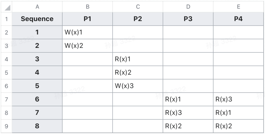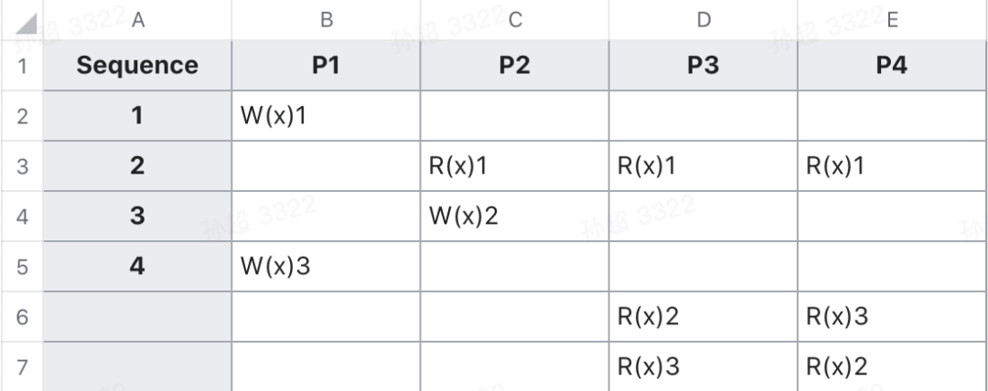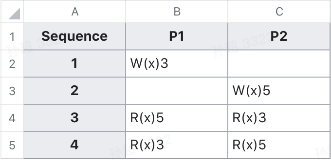 一个 wikipedia 的例子:其中 x 的初始值是 0,P 代表 processor, W 代表 write,R 代表 read。