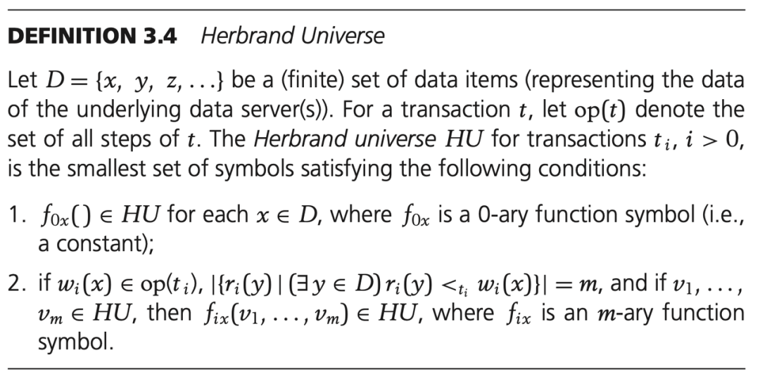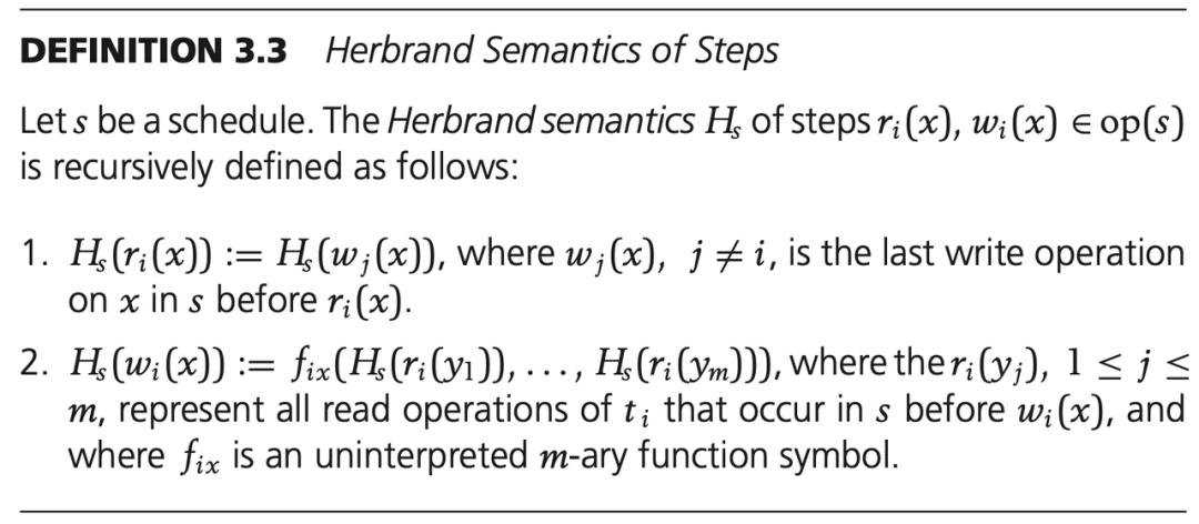下面对可串行化下的概念进行介绍,其中 Herbrand Semantics of Steps、Herbrand Universe 和 Schedule Semantics 三个概念没兴趣可以不去了解。另外对于后面的每一个可串行化概念,都可以不看定义,直接看图下的文字解释。