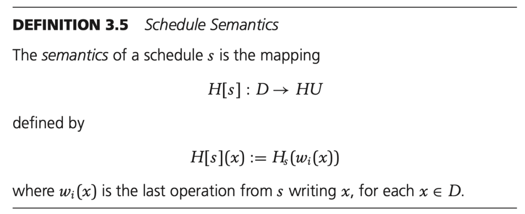 其中 op(s) 表示调度 s 中的所有操作,H[s] 简单理解是表示调度 s 中所有项的最后一个写入的集合。