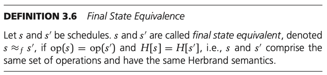 简单来说,对于两个调度 s 和 s',如果他们的所有操作相同,并且每一个数据项的最后写入相同,则 s 和 s' 是终态等价的。
