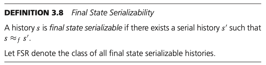 对于一个历史 s,如果存在一个串行的历史 s' 和 s 终态等价,则称历史 s 是终态可串行化的。用 FSR 表示所有终态可串行化的调度历史聚类。