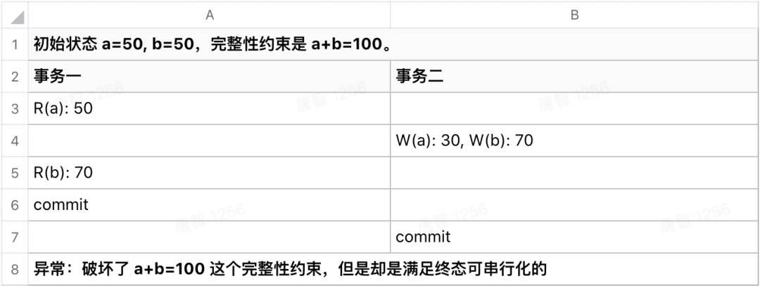 终态可串行化实际没有应用的,且不说终态等价的验证复杂度,从定义可以看出对于终态的等价性上并没有考虑只读事务的终态,而这会导致读不一致异常的发生: