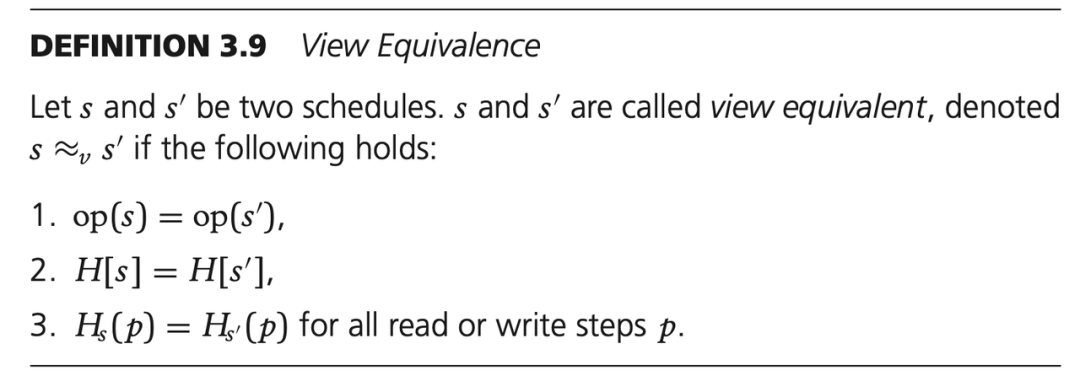 简单来说,对于两个调度 s 和 s',如果满足终态等价的要求之外,还要满足 过程中每一个操作的 Herbrand 语义(上下文和作用效果) 相同,则 s 和 s' 是视图等价的。