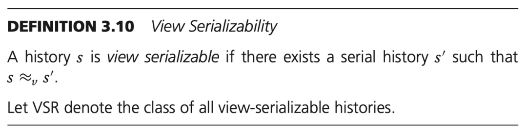 对于一个历史 s,如果存在一个串行的历史 s' 和 s 视图等价,则称历史 s 是视图可串行化的。用 VSR 表示所有视图可串行化的调度历史聚类。