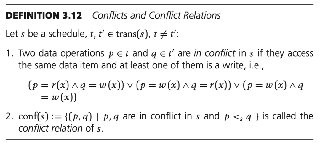 简单来说就是在一个调度 s 的两个事务中,如果它们有操作相同的数据项并且至少有一个是写操作,则认为这两个事务中的操作构成冲突关系,s 中所有的冲突表示为 conf(s)。