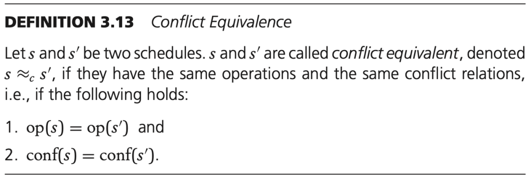 对于两个调度 s 和 s',如果他们的所有操作相同,并且有相同的冲突关系,则 s 和 s' 是冲突等价的。