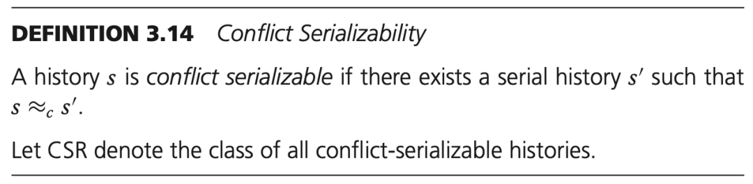 对于一个历史 s,如果存在一个串行的历史 s' 和 s 冲突等价,则称历史 s 是冲突可串行化的。用 CSR 表示所有冲突可串行化的调度历史聚类。由于只考虑冲突部分,可以直观的了解到:CSR ⊂ VSR ⊂ FSR。