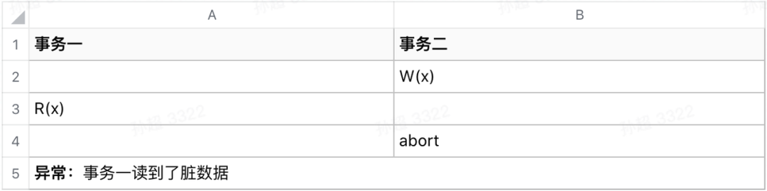 一个事务读到了另一个进行中事务的中间结果。实现比如读和写的锁都仅限于读写的时刻,用完之后立刻释放。一般情况下应该没有人用这种隔离级别,这基本相当于没有事务,那也就没必要使用事务了,这里只是介绍一下概念。
