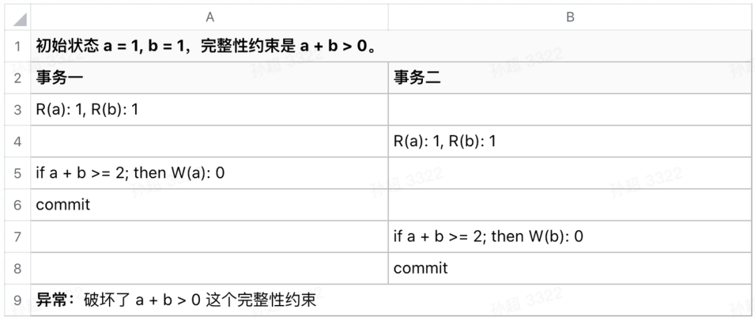 事务是满足快照隔离的,不存在不可重复读和幻读。存在写偏斜(WriteSkew)异常:读和写之间没有并发控制。