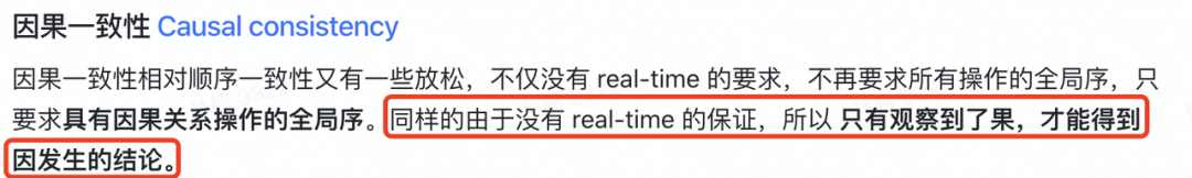因果一致性相对顺序一致性又有一些放松,不仅没有 real-time 的要求,不再要求所有操作的全局序,只要求具有因果关系操作的全局序。同样的由于没有 real-time 的保证,所以只有观察到了果,才能得到因发生的结论。