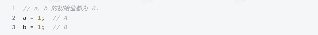 我们考虑单线程执行的情况,对于上面的代码,A sequenced-before B,由于单线程考虑,因此 A happens-before B,但是实际执行时顺序可以是 B 先执行 A 后执行。可以看出,这并没有破坏 happens-before 对 visible 性的保证,最终结果是等价于 A 先执行 B 后执行,所以 B 先于 A 执行依然满足 happens-before 语义,但 execution order 不是 program order。