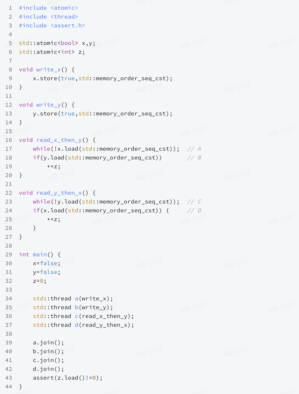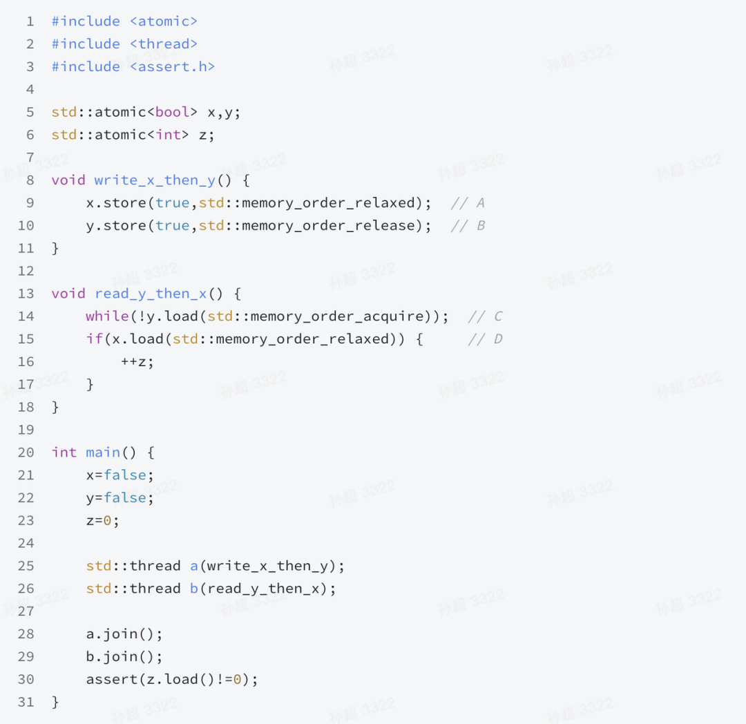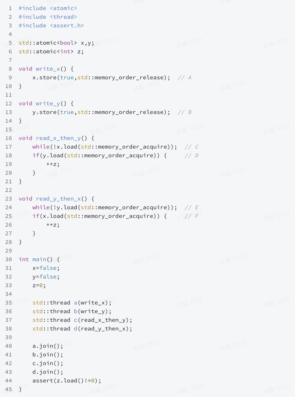 直观的理解:由于 x 和 y 都是 memory_order_seq_cst memory_order,所以具有全局序。因此当 B 判定失败导致 z 没有 ++,那说明对于 read_x_then_y 来说,顺序是 x = true -> y = true -> x = true -> y = false,这个顺序对于 read_y_then_x 来说,一旦 C 通过,因为 x = true 在 D 之前,所以 D 也会判定通过,进而 z 会 ++,其他情况读者可以自行分析。另外,语义上的理解可以参考 <<C++ Concurrency in Action>> 的 5.3.3 一节。