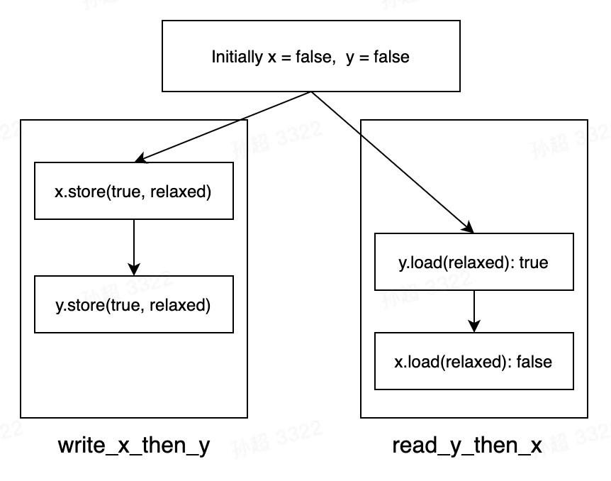 这个例子中,assert 判定可能会失败。不同于 memory_order_seq_cst,Release-Acquire 没有全局序,因此没办法按照 Sequential 例子中的语义做同步了。简单理解就是 x 和 y 没啥关系,随便乱序。