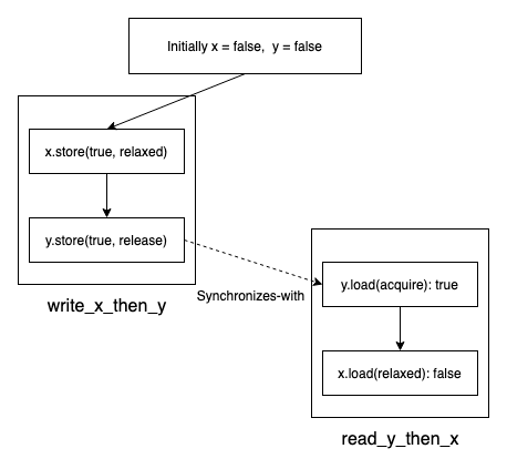 语义上理解:如下图,不同线程中的 A 没有和 C 建立 synchronizes-with 关系,所以 也就没有 A happens-before C 的关系,所以 read_y_then_x 中 d 执行见到的 x 可能还是 false。