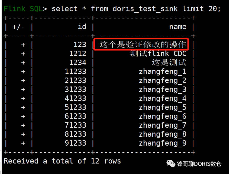 update test_cdc set name='这个是验证修改的操作' where id =123再去观察Doris表中的数据,你会发现已经修改