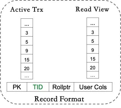 2.检索行记录,根据 TID 到 Read View 中进行二分查找,判断可见性。
