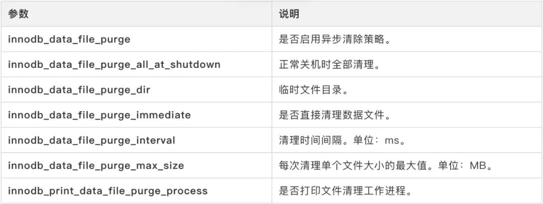 mysql> select * from information_schema.innodb_purge_files;+--------+---------------------+--------------------+---------------+-------------------------+--------------+| log_id | start_time | original_path | original_size | temporary_path | current_size |+--------+---------------------+--------------------+---------------+-------------------------+--------------+| 0 | 2021-05-14 14:40:01 | ./file_purge/t.ibd | 146800640 | ./#FP_210514 14:40:01_9 | 79691776 |+--------+---------------------+--------------------+---------------+-------------------------+--------------+1 row in set (0.20 sec)
