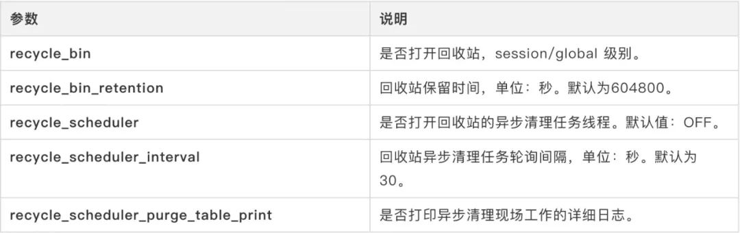 -- Purge Tabledbms_recycle.purge_table('<TABLE>');-- Restore tabledbms_recycle.restore_table('<RECYCLE_TABLE>','<DEST_DB>','<DEST_TABLE>');-- Show tablesmysql> call dbms_recycle.show_tables();+-----------------+---------------+---------------+--------------+---------------------+---------------------+| SCHEMA | TABLE | ORIGIN_SCHEMA | ORIGIN_TABLE | RECYCLED_TIME | PURGE_TIME |+-----------------+---------------+---------------+--------------+---------------------+---------------------+| __recycle_bin__ | __innodb_1063 | product_db | t1 | 2019-08-08 11:01:46 | 2019-08-15 11:01:46 || __recycle_bin__ | __innodb_1064 | product_db | t2 | 2019-08-08 11:01:46 | 2019-08-15 11:01:46 || __recycle_bin__ | __innodb_1065 | product_db | parent | 2019-08-08 11:01:46 | 2019-08-15 11:01:46 || __recycle_bin__ | __innodb_1066 | product_db | child | 2019-08-08 11:01:46 | 2019-08-15 11:01:46 |+-----------------+---------------+---------------+--------------+---------------------+---------------------+4 rows in set (0.00 sec)