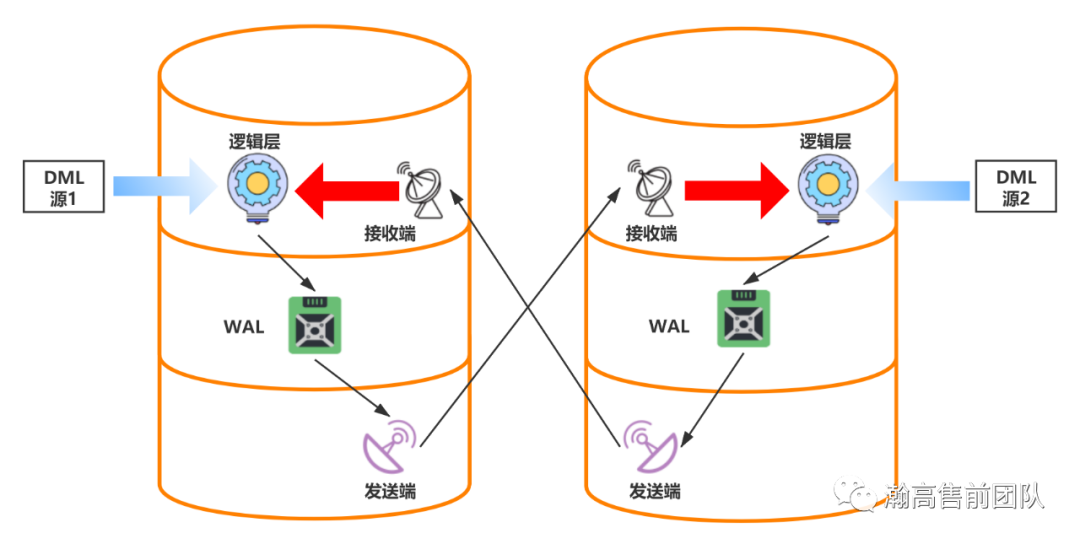 为了解决ping-pong的问题,需要增设数据源筛选的功能,在接收到DML请求时,对逻辑层实际需要replay的部分进行鉴别,即可以识别下图中,蓝色和红色箭头的请求是否由为重复发起,以实现数据一致,避免进入ping-pong循环。