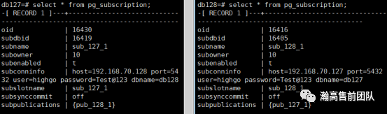 create subscription sub_127_1 connection 'host=192.168.70.128 port=5432 user=highgo password=Test@123 dbname=db128' publication pub_128_1 with(copy_data=false);