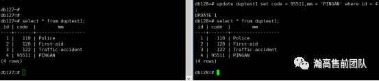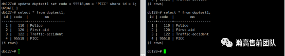 update duptest1 set code = 95511,mm = 'PINGAN' where id = 4;