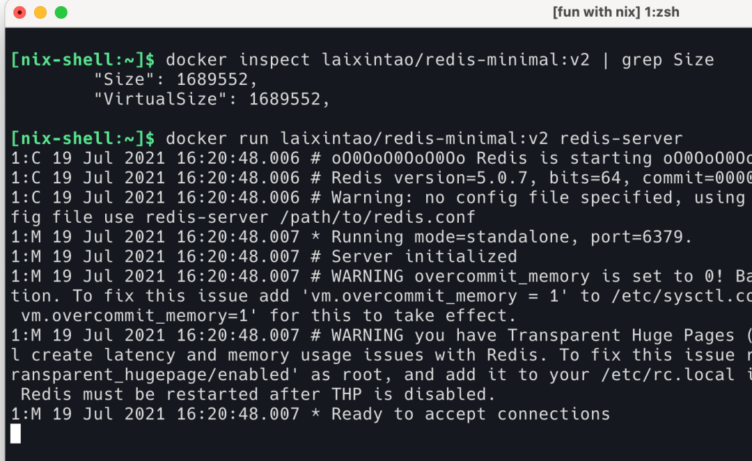 [nix-shell:~]$ docker load -i resultLoaded image: nix-redis-minimal:latest[nix-shell:~/export-docker-image]$ docker imagesREPOSITORY TAG IMAGE ID CREATED SIZEnix-redis-minimal latest 433cad4ad790 51 years ago 1.69MB[nix-shell:~]$ docker run nix-redis-minimal:latest redis-server1:C 19 Jul 2021 16:37:09.847 # oO0OoO0OoO0Oo Redis is starting oO0OoO0OoO0Oo1:C 19 Jul 2021 16:37:09.847 # Redis version=5.0.7, bits=64, commit=00000000, modified=0, pid=1, just started1:C 19 Jul 2021 16:37:09.847 # Warning: no config file specified, using the default config. In order to specify a config file use redis-server /path/to/redis.conf1:M 19 Jul 2021 16:37:09.848 * Running mode=standalone, port=6379.1:M 19 Jul 2021 16:37:09.848 # Server initialized1:M 19 Jul 2021 16:37:09.848 # WARNING overcommit_memory is set to 0! Background save may fail under low memory condition. To fix this issue add 'vm.overcommit_memory = 1' to /etc/sysctl.conf and then reboot or run the command 'sysctl vm.overcommit_memory=1' for this to take effect.1:M 19 Jul 2021 16:37:09.848 # WARNING you have Transparent Huge Pages (THP) support enabled in your kernel. This will create latency and memory usage issues with Redis. To fix this issue run the command 'echo never > /sys/kernel/mm/transparent_hugepage/enabled' as root, and add it to your /etc/rc.local in order to retain the setting after a reboot. Redis must be restarted after THP is disabled.1:M 19 Jul 2021 16:37:09.848 * Ready to accept connections
