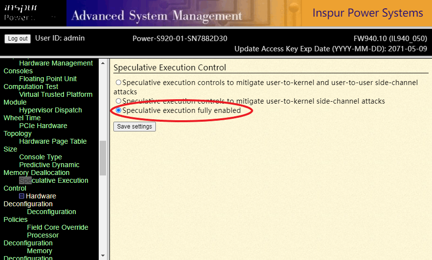 由于 POWER9 各机型默认激活了该补丁,在网络瓶颈场景下性能影响可能会比较明显。建议在 ASMI 上关闭此 firmware 补丁(选红色框,即Speculative execution fully enabled),如下图 ( 注意,该修改必须在下电的情况下才能进行 ) :