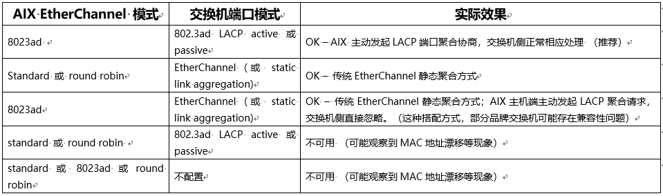 在 AIX 上建议的 EtherChannel 配置模式为 802.3ad, Hash Mode 采用 src_dst_port . 具体如下: