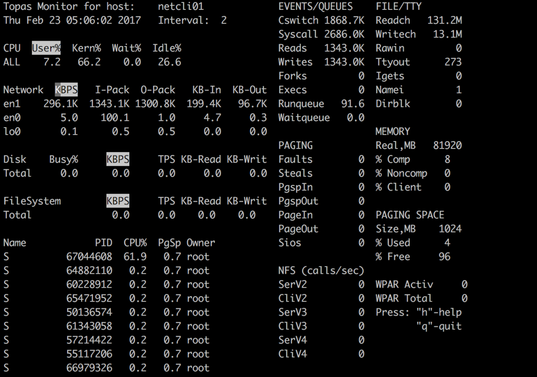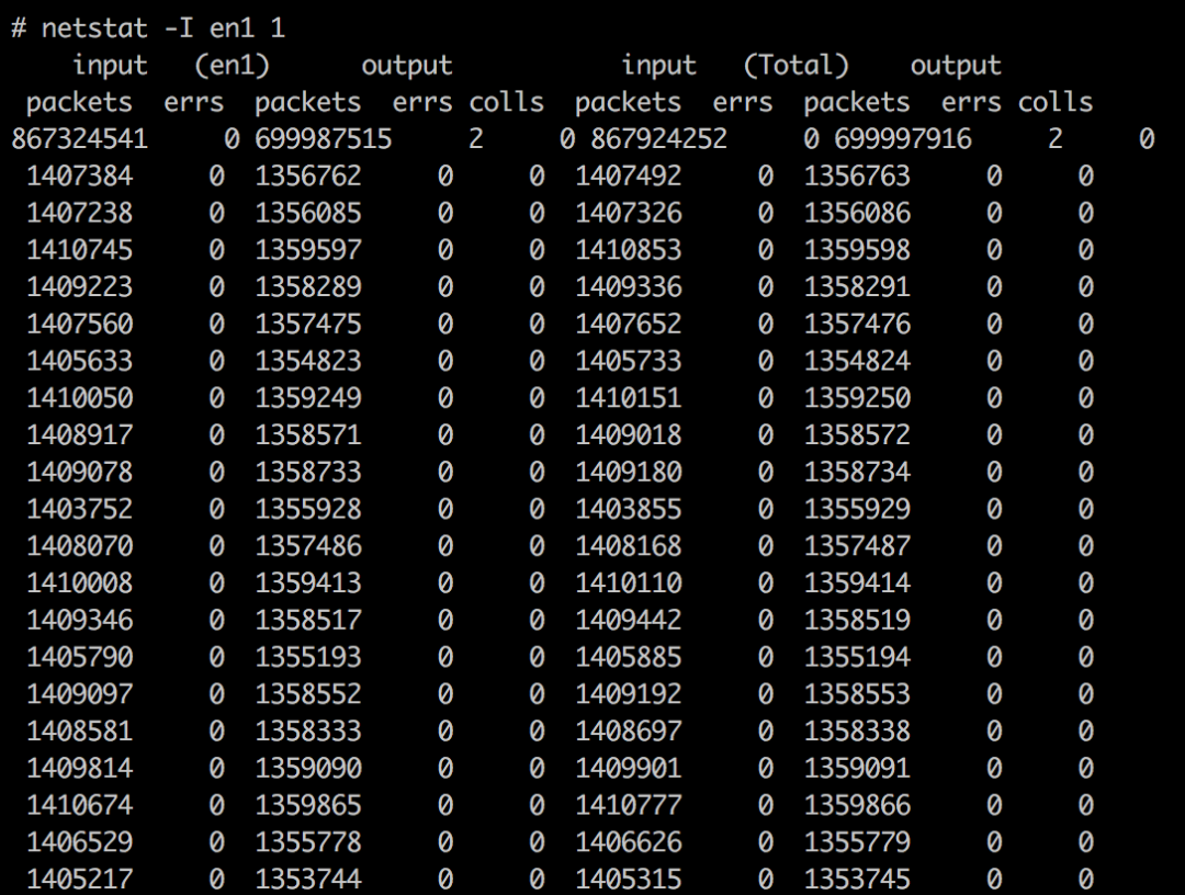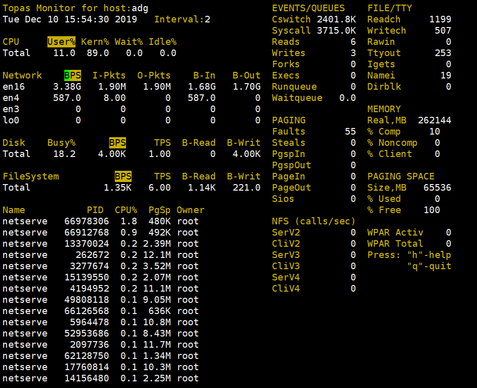 由于统计工具不同,在系统压力极大的情况下,命令响应时间受到了一定影响,统计数据有少许偏差。其中 topas 统计结果偏大,为 320 万 PPS ;而 netstat 与 nmon 统计结果接近,为 280 万 PPS 。
