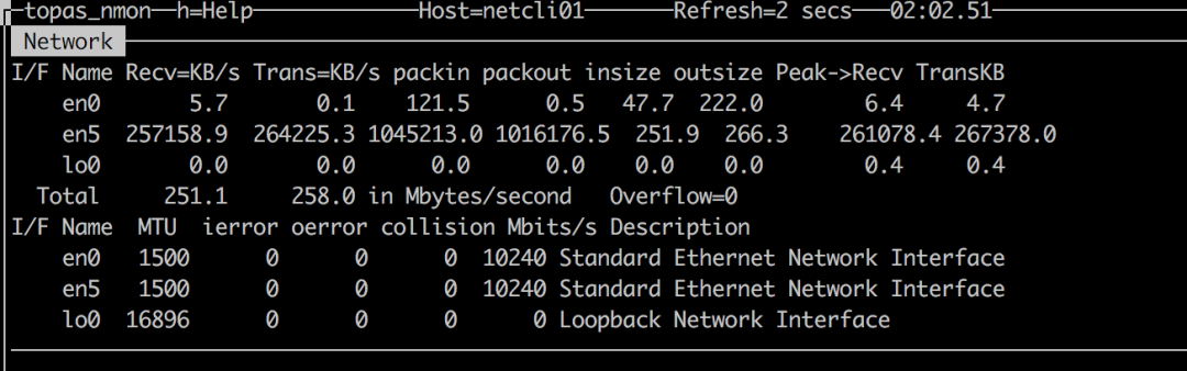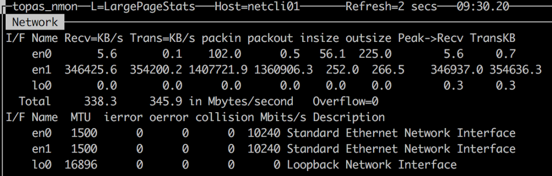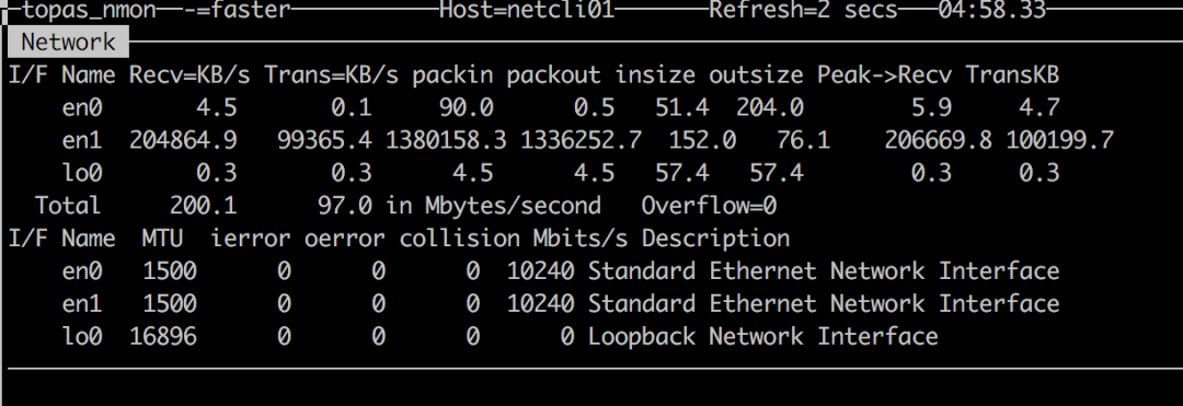 统计结果的差异与统计命令实际采用的时间间隔精度有关, topas 最为常用,但 netstat 与 nmon 的结果应该更接近实际值。