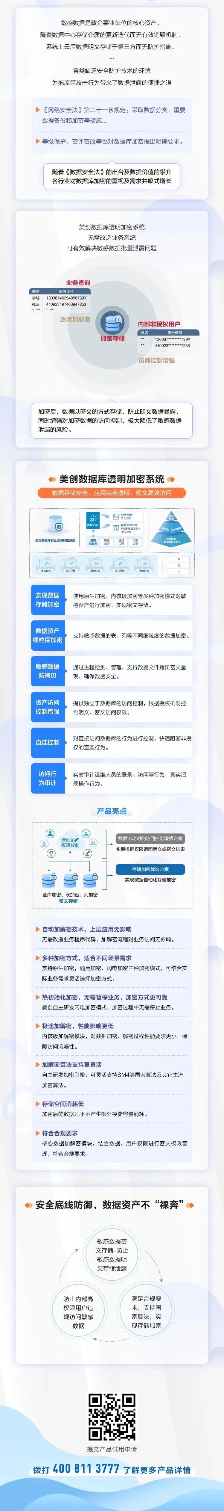 随着《中华人民共和国密码法》出台以及国家相关政策标准制定,商用密码认证制度逐步完善,大大促进密码技术进步、产业发展和规范应用。存储加密是数据库主要的安全防护技术手段,数据库透明加密系统作为美创科技自主研发的安全产品,通过美创科技自研加密引擎,用户无需改造业务系统,即可有效解决明文存储造成的黑客拖库、越权访问、磁盘丢失等数据泄密问题。