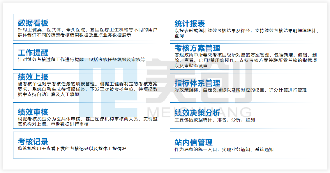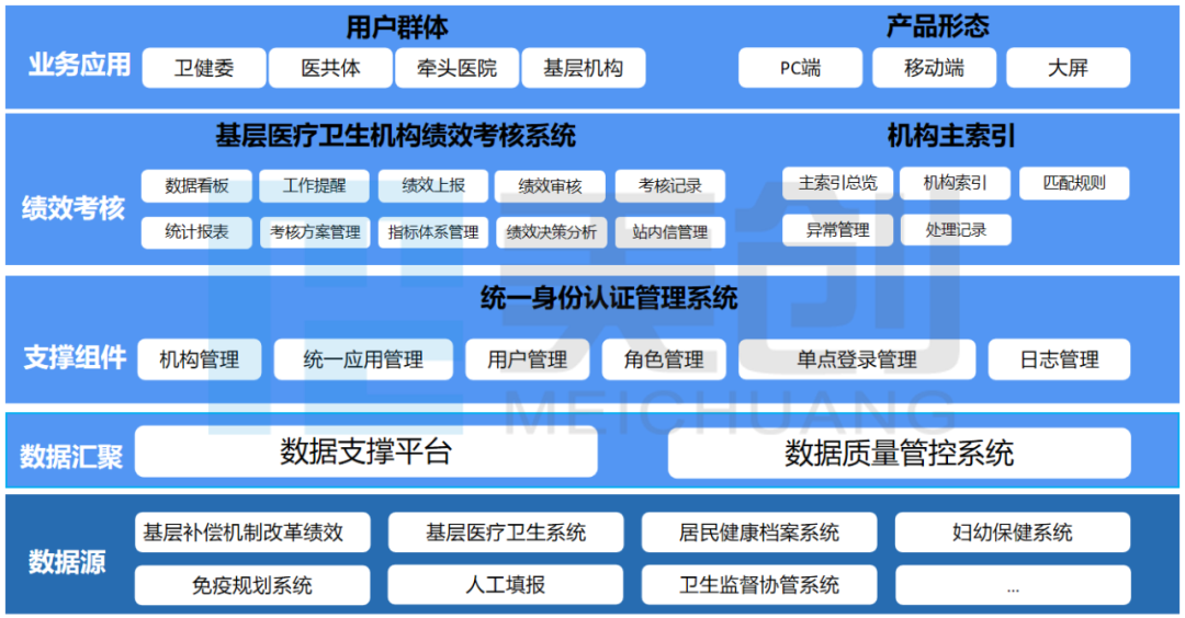 从中央到地方,一系列政策的推出,旨在通过建立健全绩效考核机制,进一步发挥基层医疗卫生机构健康“守门人”作用。美创科技作为领先的数字化转型解决方案供应商,在深入研究分析我国医疗信息化和绩效考核改革相关政策的基础上,对基层医疗卫生机构绩效考核建设进行实践性探索。
