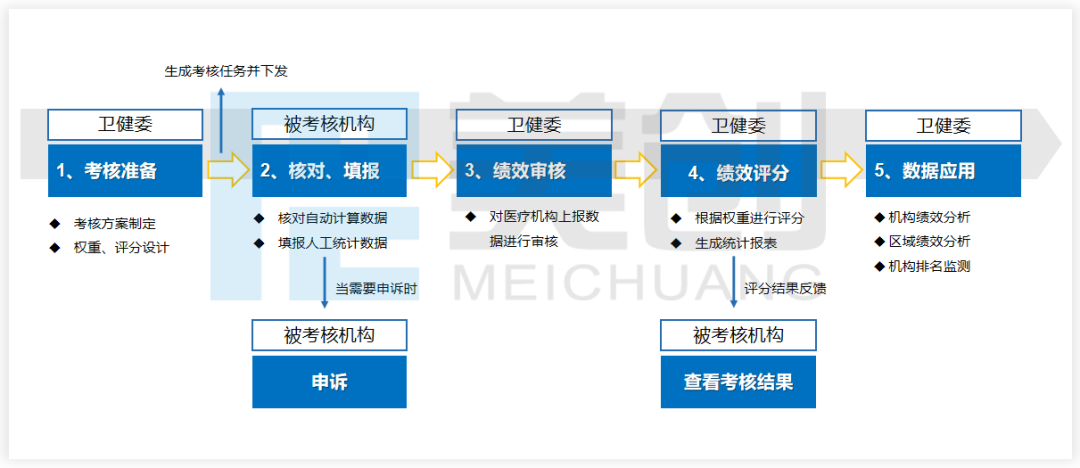 流程包括:考核方案制定、自动采集数据、自动数据质控和指标计算、核对计算结果、人工统计数据填报、分权限数据审核、绩效评分、被考核单位确认及申诉、考核人员审核确认、绩效考核结果分析等。